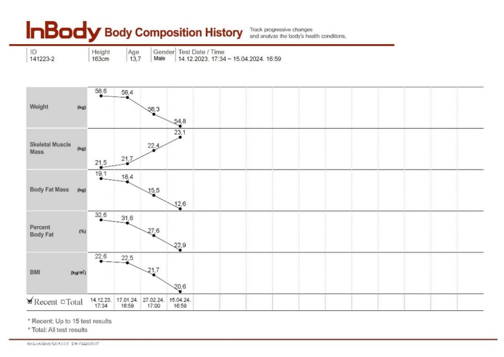 Na nutricionističkom pregledu utvrdili smo energetske i nutritivne potrebe, analizirali prehrambene navike i krenuli u izradu individualnog sportskog jelovnika. Pridržavanjem programa, u trajanju od 4 mjeseca, ostvareni su izvrsni rezultati. Izgubio gotovo 4 kg tjelesne mase, a od toga 6.5 kg masnog tkiva. Važno je naglasiti da se tijekom ovog procesa povećala mišićna masa, a smanjila visceralna mast (masnoća pohranjena oko unutarnjih organa). Tijekom procesa je sportaš dobivao sve hranjive tvari, dovoljne količine energije, odrađivao školske obveze i trening i što je jako bitno, ostvario medalju na sportskom natjecanju. Ono što je najvažnije je činjenica da je cijela obitelj usvojila zdrave životne navike, koje sada svi zajedno provode. Želimo ukazati kako se regulacija tjelesne mase može postići na zdrav i pravilan način i da nisu potrebne nikakve rigorozne restrikcije u prehrani. Ključ je, opet se pokazalo, u balansu.
